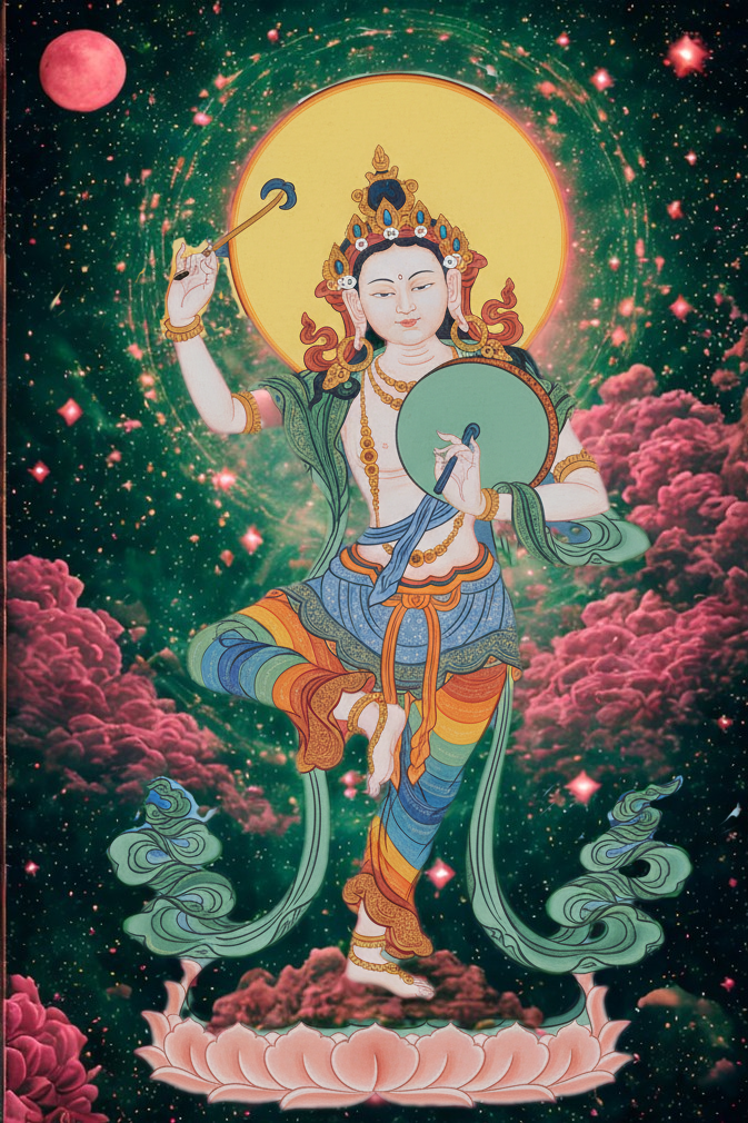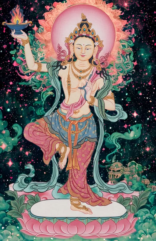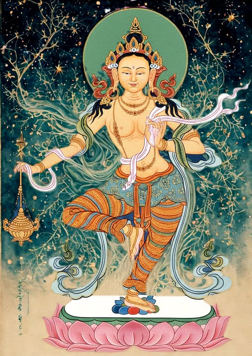 The “Offering Garlands and Seeking Fragrance from the Sixteen Vajra Goddesses” is the most effective method for making offerings to the Ancestral Master. It is best to practice it daily; if not, practice it on the 10th or 25th of each lunar month. After making the offering, make a sincere prayer, and your wish will surely be fulfilled. The Sixteen Vajra Goddesses refer to: Four Goddesses of Outer Beauty: the Goddess of Beauty, the Goddess of Jewel Garlands, the Goddess of Songs, and the Goddess of Dances; Four Goddesses of Inner Beauty: the Goddess of Fragrance, the Goddess of Flowers, the Goddess of Light, and the Goddess of Perfume; Five Secret Consorts: the Goddess of Mirrors, the Goddess of Round Drums, the Goddess of Pipas, the Goddess of Eagle Flute, and the Goddess of Waist Drums; and Three Goddesses of Shared Desire: the Goddess of Desire, the Goddess of Taste, and the Vajra Goddess of Wonderful Dharma.