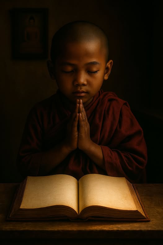 圖像主題:紅衣小僧靜坐於昏暗室內,面前空白經卷微光閃耀,雙手合十,神情沉靜。