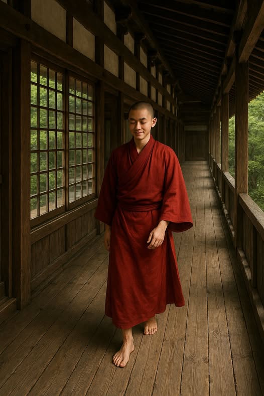晨光初照,寺院的緣側走廊靜默如昔。深色木樑與風化地板在光影中泛起歲月的紋理,格子窗外,綠樹搖曳,葉影斑駁如禪語。紅衣小僧赤足踏上木板,紅衣輕拂,如一抹靜水中流動的火焰。他眼簾半垂,嘴角含笑,步履無聲,彷彿整個世界都在他的呼吸之中緩緩展開。