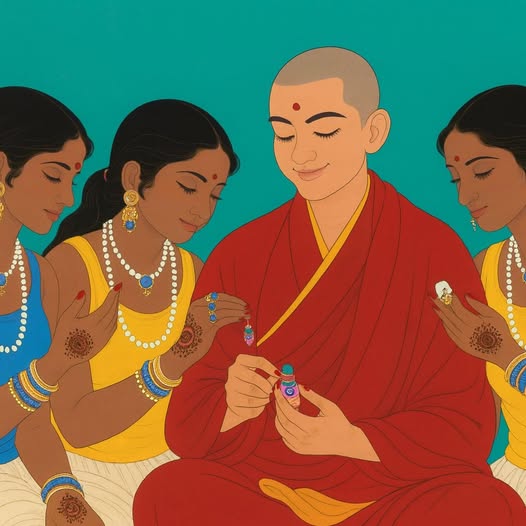 三位女子圍坐在他身旁,衣飾鮮麗,手上繪著細緻的花紋。