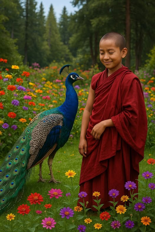 孔雀象徵著能將毒轉為彩羽的力量,而修行者象徵著能將苦轉為慈悲的心。兩者在花園裡相遇,彷彿在提醒:修行並非遠離世界,而是在世界裡學會溫柔地與萬物相處。花開花落、鳥來鳥去,皆是法;一念歡喜、一念安然,也皆是法。