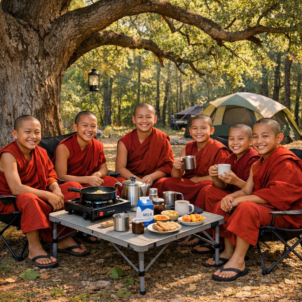 當陽光斜灑在林間,橡樹下的矮桌旁,六位年輕僧人圍坐於露營椅上,紅色僧衣在晨光中泛著柔和的暖意。他們的笑容如林葉間的光斑,輕盈而真切,彷彿整個森林都靜靜聆聽著他們的歡聲。