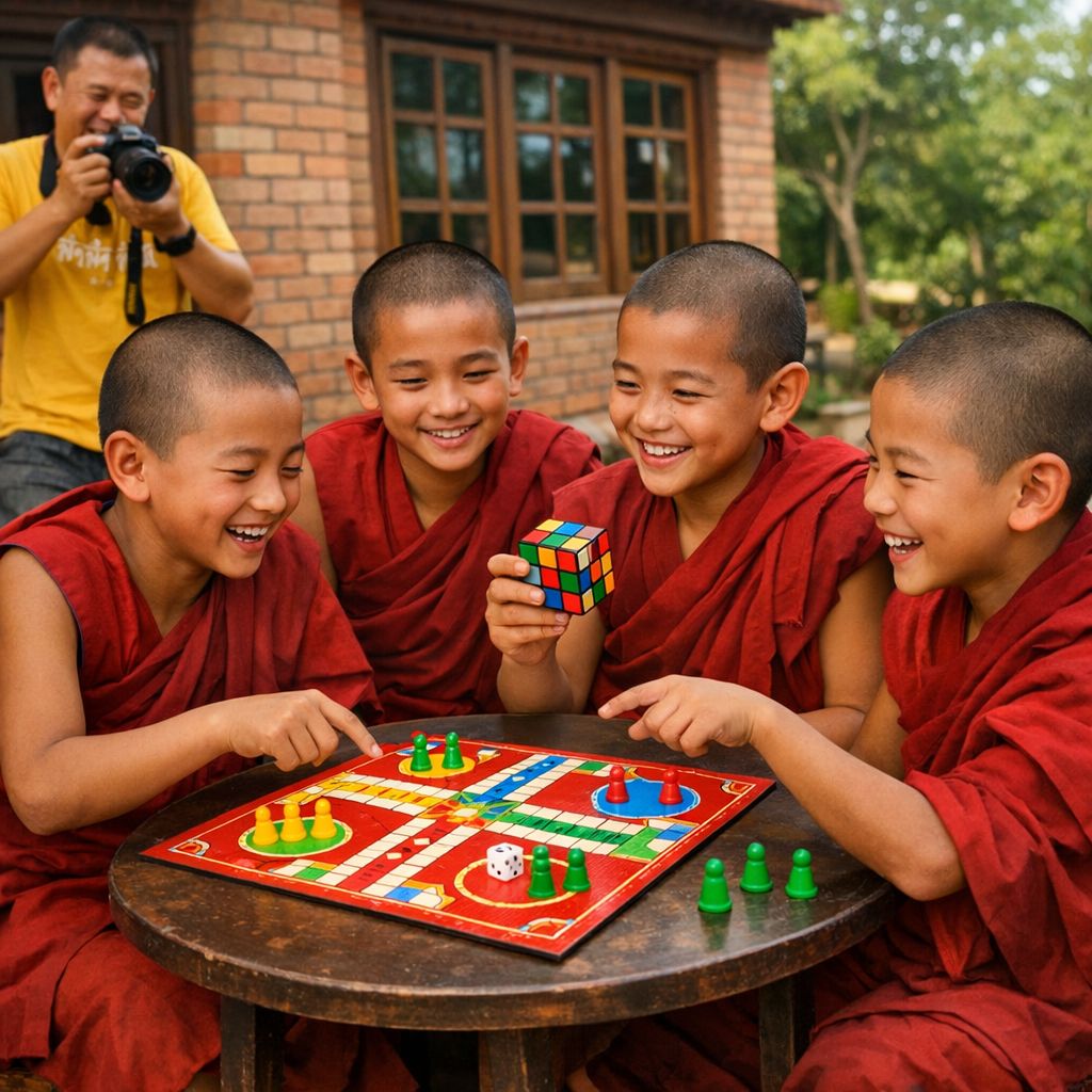 ——午後的陽光斜灑在磚砌寺院的庭院裡,光線柔和如絹,映在一張小圓木桌上。四位身穿紅色僧衣的小沙彌圍坐其旁,笑聲如泉水般清脆,在空氣中跳躍。他們的眼神專注而明亮,彷彿整個世界只剩下眼前這塊紅色棋盤。