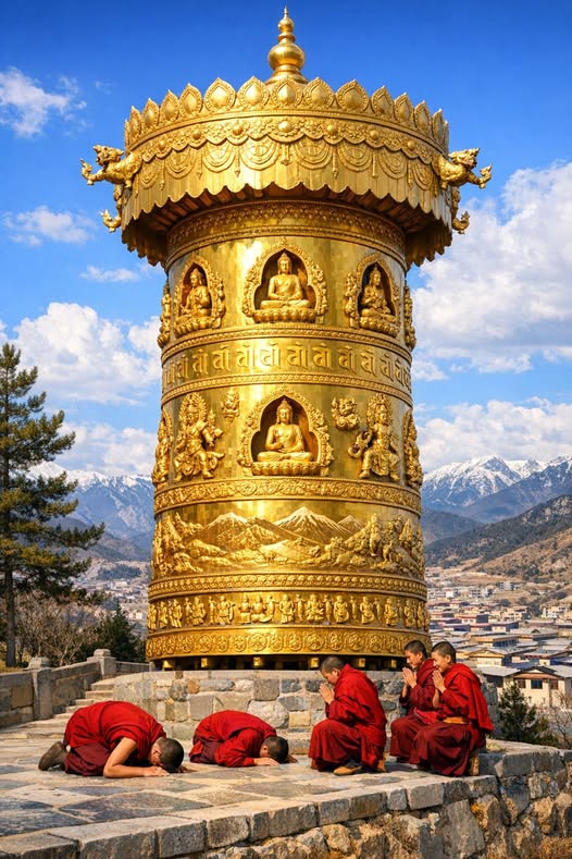 金色轉經筒矗立在高台之上,陽光灑落時,它閃耀如天界的心臟。那是一種不言而喻的莊嚴,彷彿整個山谷都在靜靜聆聽它的呼吸。