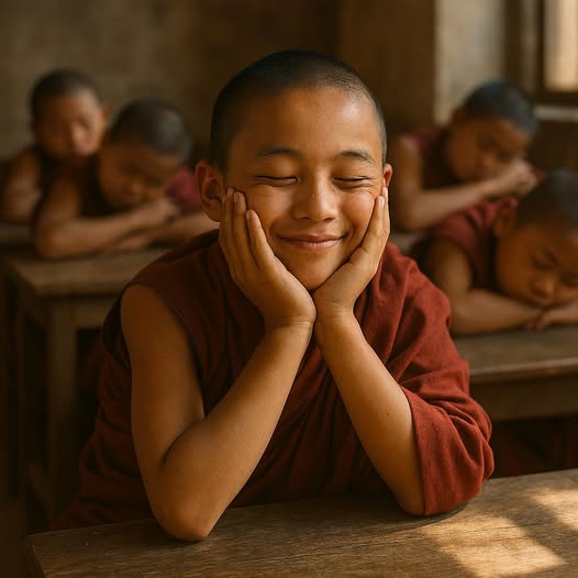 在他身後,其他孩子也靜靜地趴在桌上,閉著眼睛,沉入各自的寧靜。有人雙手交疊枕著額頭,有人臉頰貼著木桌,呼吸輕柔如風。紅色的僧衣在陽光下泛著暖意,像一片片熟透的果實,安穩地掛在枝頭。